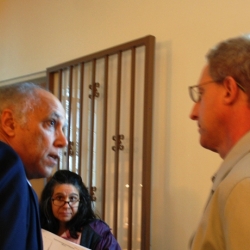 Gary Polakovic, right, tells Dan Hirsch that he covered the issue fairly when he wrote for the LA Times, before becoming Boeing's PR man trying to sell SSFL as clean. Hirsch told him that made it all the more shameful. Polakovic's plan is the subject of Part One - "Greenwashing Rocketdyne."