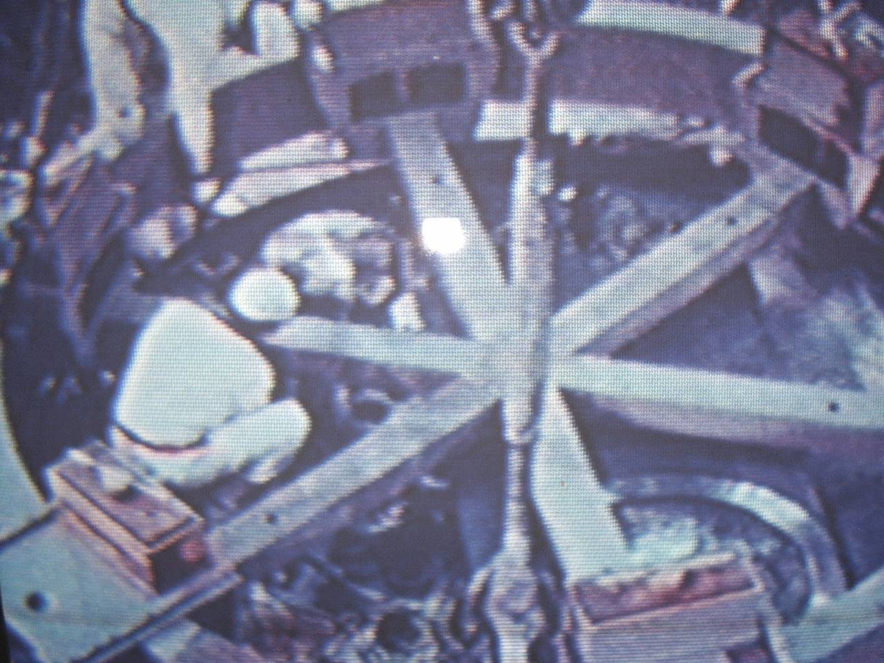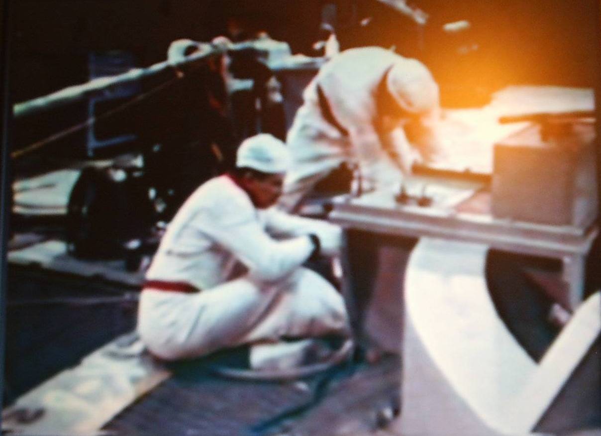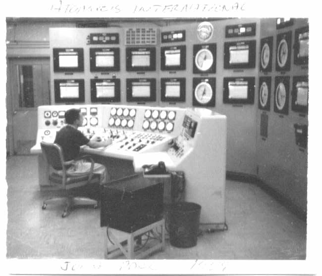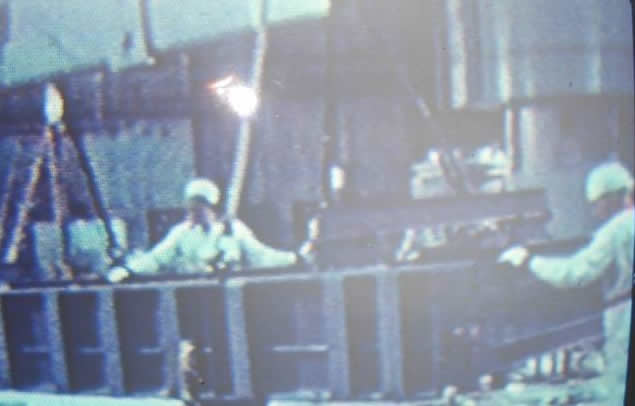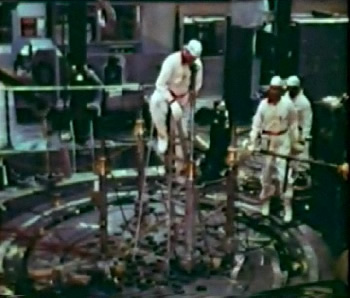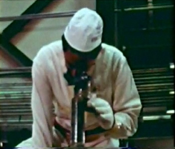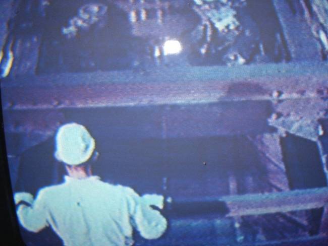 “This is a picture of the men trying to unstick the second fuel rod that broke off in the reactor, Pace told EnviroReporter.com. “They are looking under the lead shield of the Fuel transporter trying to see where the broken fuel rod was stuck at. They are on top of the reactor getting radiation from the reactor core through the open fuel rod hole with the fuel rod half in and out of the reactor. You will see one man with a gas mask on and the other laying down looking under the lead safety shield with a flashlight and no gas mask breathing in all that radiation.
