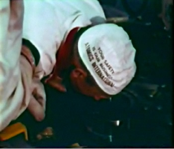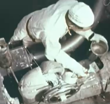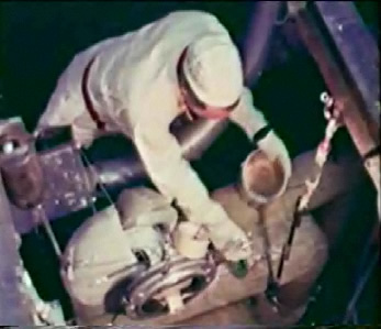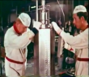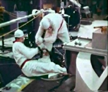 Pace aligning up a piece of equipment on top of the reactor. He is not looking directly into the core. His Atomics International cap reads "Your Safety