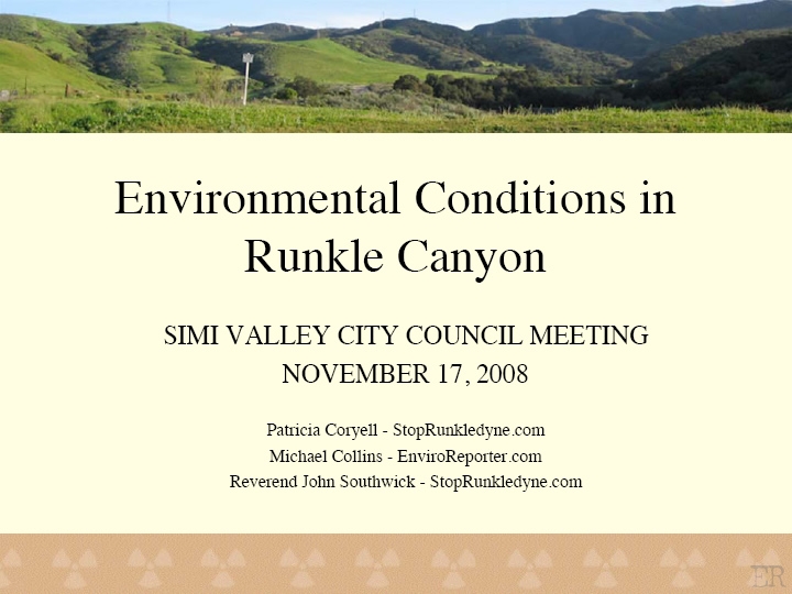 On November 17, 2008, the DTSC’s Norm Riley, project head for the Runkle Canyon voluntary cleanup agreed to with KB Home, gave a presentation about the site to the Simi Valley City Council and community. The meeting was televised and streamed online. The Radiation Rangers also gave a PowerPoint presentation which was aided by EnviroReporter.com’s Michael Collins and Denise Anne Duffield which is available here in PDF form. Our coverage of this pivotal event in the fight over Runkle Canyon’s contamination problems, “Simi Valley supports Supplemental EIR for Runkle Canyon,” details the presentations, public comments and the city council’s milestone reaction.